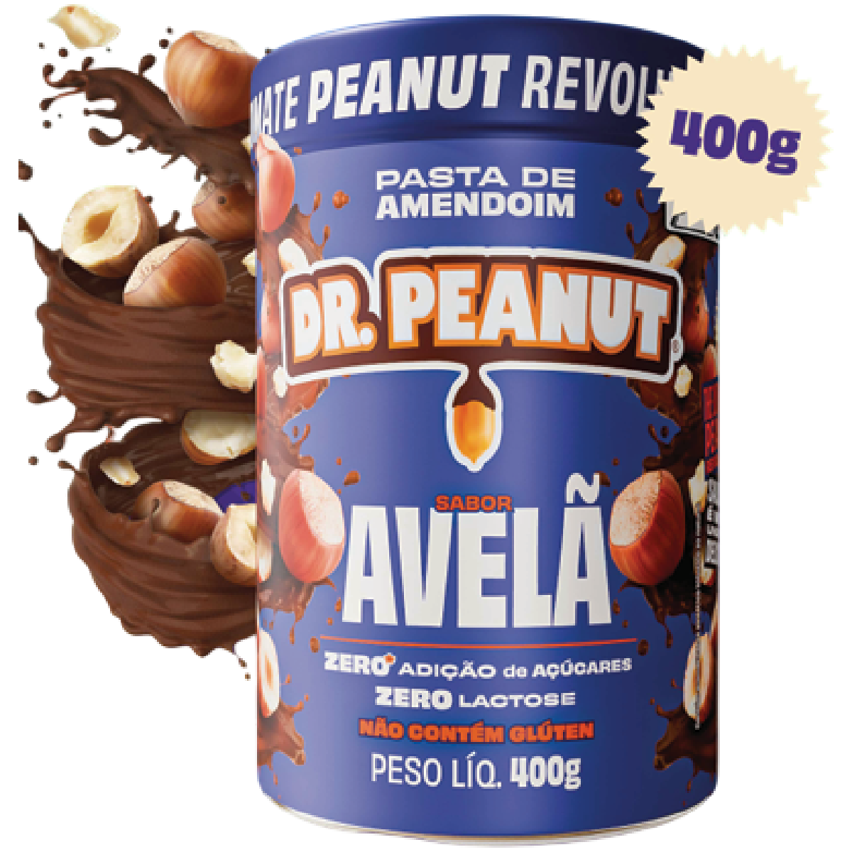 Pasta de amendoim sabor avelã com whey protein e adoçantes, pronta para consumo. Produto sem adição de açúcares, zero lactose e não contém glúten.